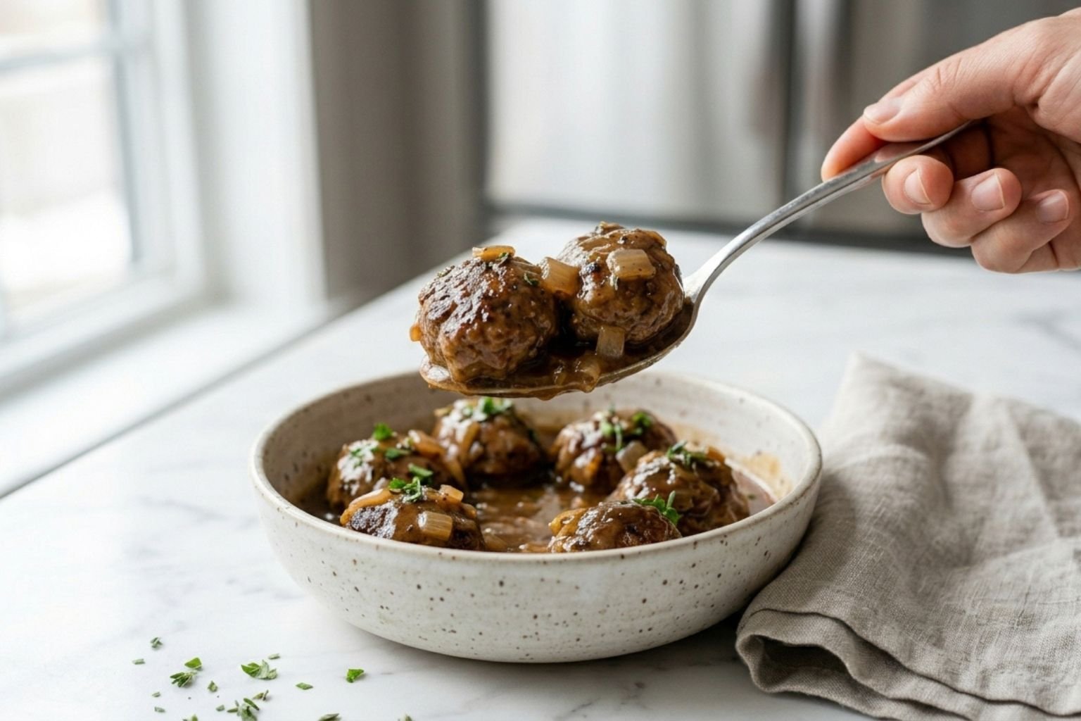 The gravy is typically made with beef broth, onions, Worcestershire sauce, and a blend of seasonings that give it that classic deep flavor. As the meatballs cook slowly, they become incredibly tender and juicy while absorbing every bit of that savory goodness.