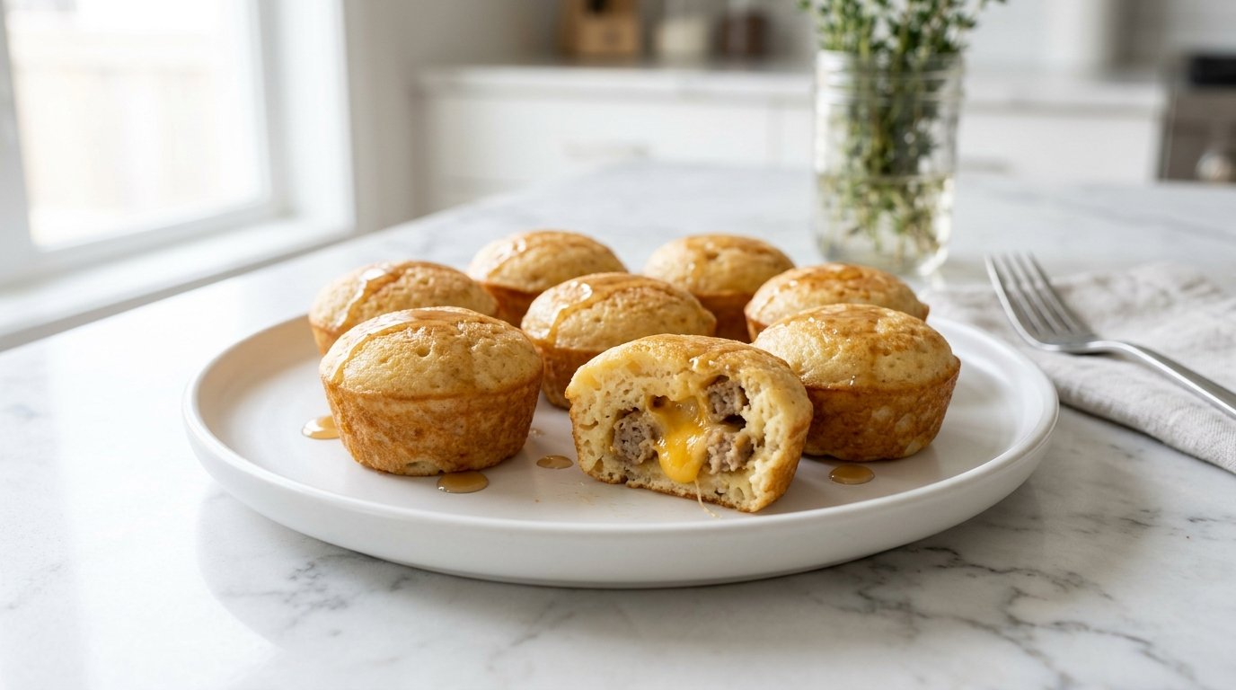 Instead of assembling separate pancakes and fillings, everything is mixed or layered into small portions, making it easy to cook and serve. The result is a soft, fluffy bite with a slightly crispy edge, filled with savory sausage and melted cheese.